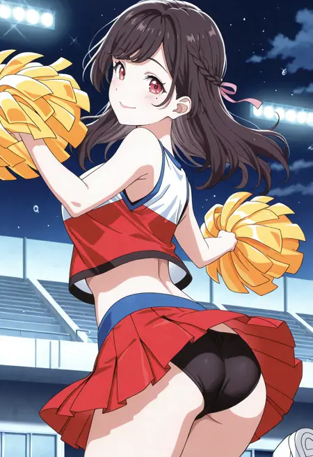 ponytail, cheerleader, pleated skirt, red miniskirt, pom pom \(cheerleading\), hair bow, crop top