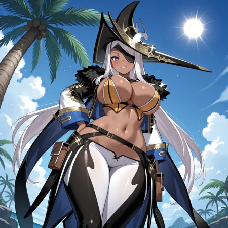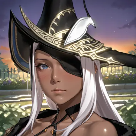 触发词: 伊卡鲁斯、深色皮肤女性、蓝色眼睛、眼罩、长发、白发、发色条纹、单条发色条纹、大胸、宽臀,