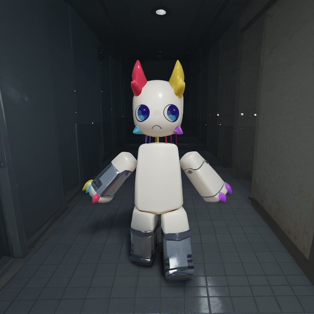 タグ: 2d、ソロ、1boy、プロトタイプ、ロボット、男性、白い体、青い目、結晶状の角、四本の爪、多色の角、多色の爪、金属製の脚輪、金属製の腕輪