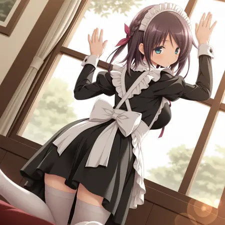 maid,maid headdress,maid apron,white apron,frilled apron,back bow,white bow,black dress,puffy long sleeves,neck ribbon,white collar,frilled collar,