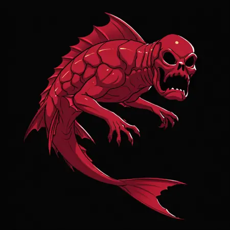 水生形态:CreepyRed,creepyred2,骨架,两只手臂,三爪手,鳍,鳍状肢,尾鳍,背鳍,胸鳍,红色皮肤,单独,空洞的眼睛,怪兽,尾巴,爪子,无人类,鱼类,