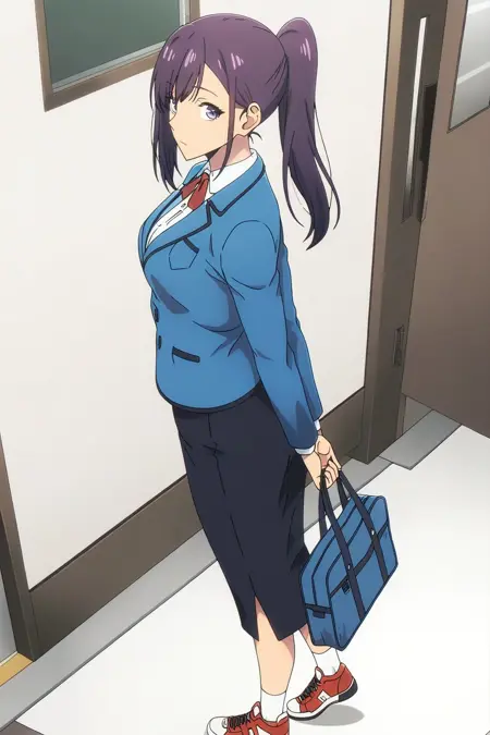 복장: 학교 균일복, 리본, 목 리본, 빨간 리본, 셔츠, 흰 셔츠, 목깃 셔츠, 블레이저, 재킷, 파란 재킷, 긴 소매, 치마, 검은 치마, 연필 치마, 양말, 흰 양말, 신발, 스니커즈, 빨간 신발,