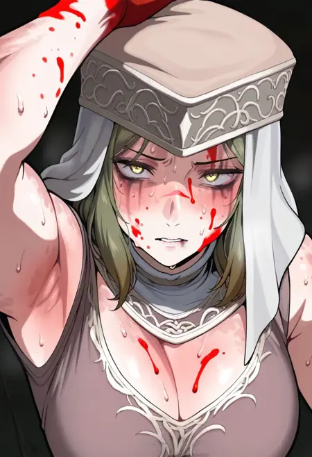 1girl, anastasia_eldenring, yellow eyes, glowing eyes, ((burn scar on face)), (chubby:0.3), (muscular:0.6), olive hair, *