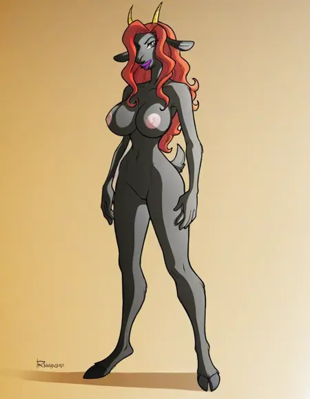 触发标签:Bloodrose、兽人、灰色毛发、红发、黄色角、直角、丰满、灰色身体、山羊耳、紫色嘴唇、蓬松尾巴