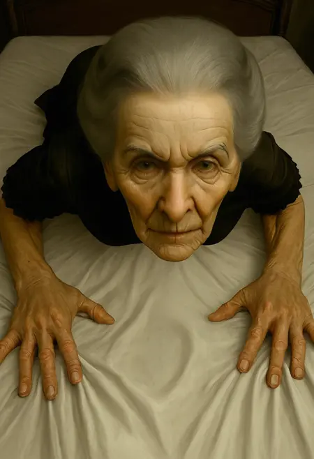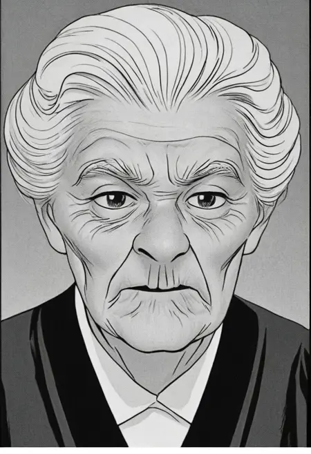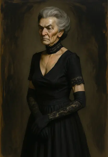 dr3r3y, elderly woman, silver hair, scowling, black dress, sharp features, deep wrinkles