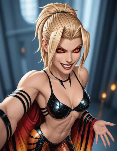 Corrupted Karaathletic body,tonedblonde,hair up,hair intakesblue eyesまたはred eyes(表情に応じてどちらか一つを選択)black leather braorange with black leather pantscloakblack leather necklacestraps around armevil grin
