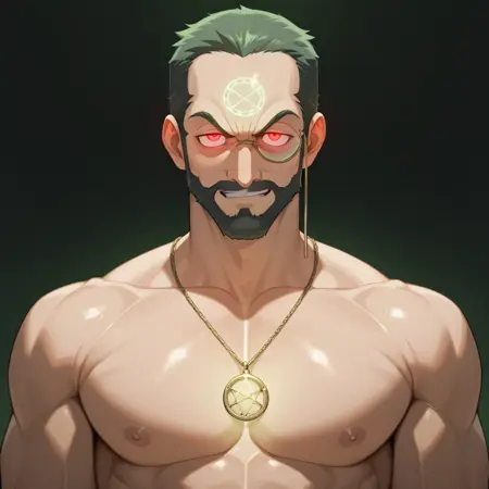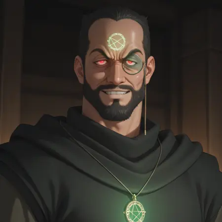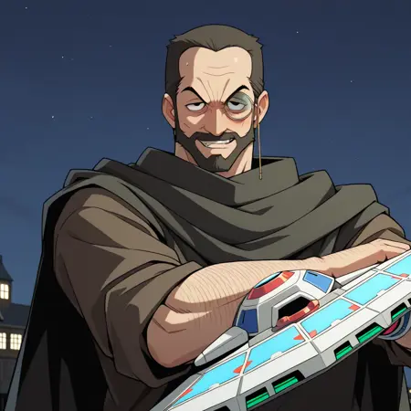 기본 외모: 망토, 단안경, 이마에 있는 상징