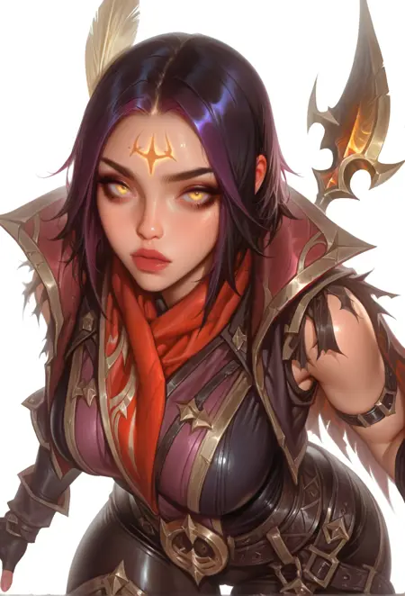 | 학습된 단어 | HN_irelia, yellow eyes, single feather on hair, short hair ,black hair, purple hair, forehead mark, shoulder armor, fingerless glove on right , feathered cape , belt with ropes, sharp ornamental details, red scarf, black tight pants, thigh-high boots복사됨! |
