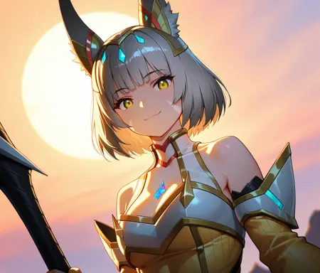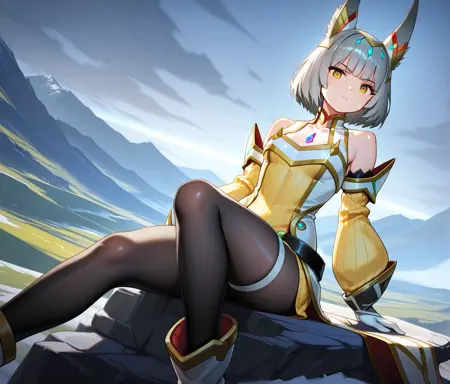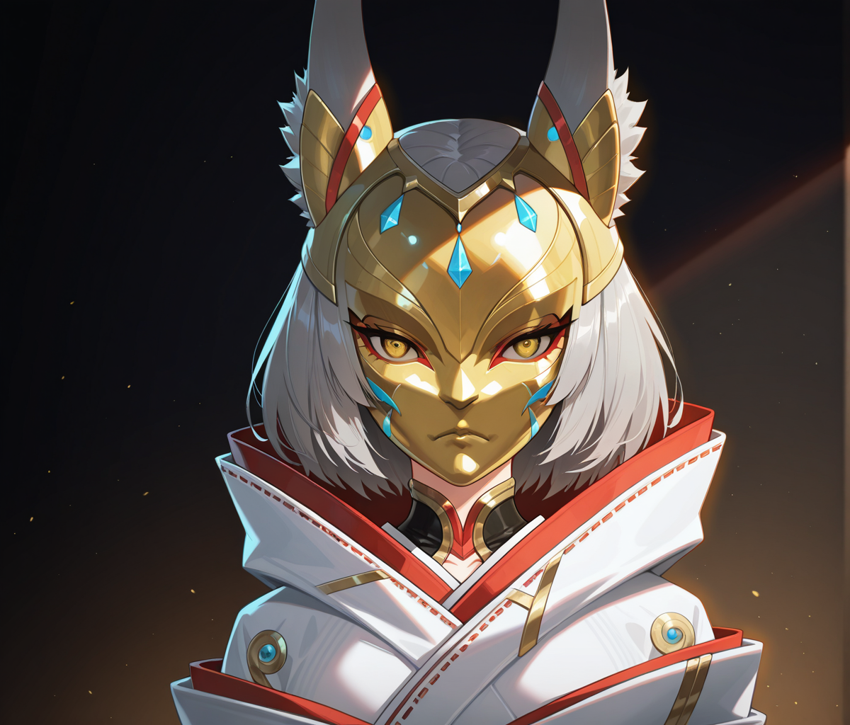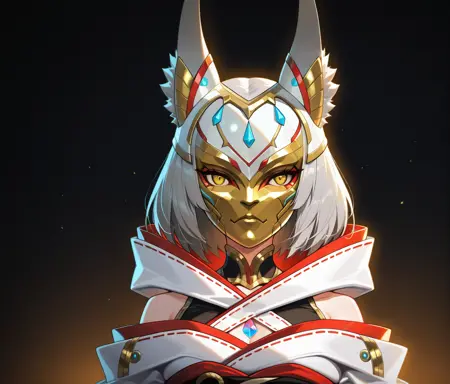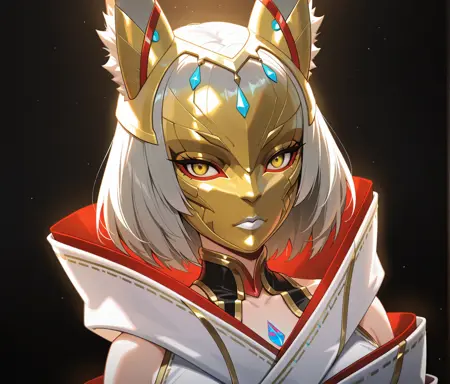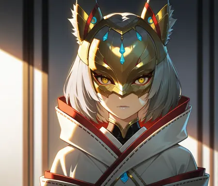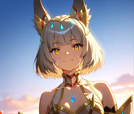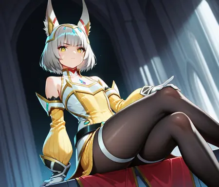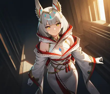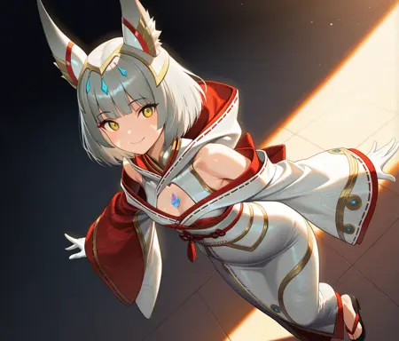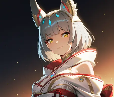 アグヌスの女王衣装: n1a-x3、queen-costume、黄色い目、短い髪、灰色の髪、小さな胸、猫の耳、動物の耳のふわふわ、猫娘、顔の模様、胸のジュエル、着物、肩出し、長い袖、白い手袋、サンダル