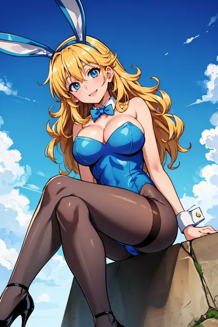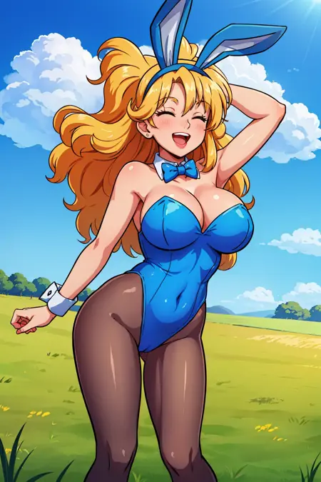 添加 "假兔耳朵、蓝色紧身衣、领结、连裤袜、腕带" 以呈现她的典型造型。