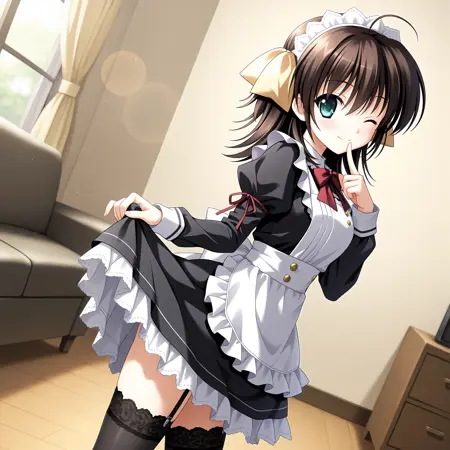 maid,maid headdress,maid apron,white bow,back bow,red bowtie,puffy long sleeves,frilled collar,white apron,sleeve ribbon,frilled thighhighs,frilled dress,black thighhighs,garter straps,