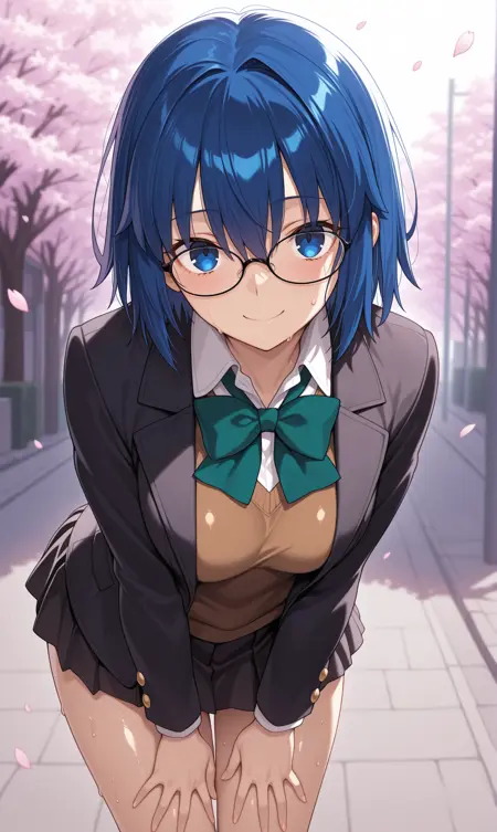 검은 블레이저, 긴 소매, 열린 옷, 녹색 리본 넥타이, 갈색 스웨터, 미니 치마, 주름 치마, 검은 치마, 검은 양말, 로퍼