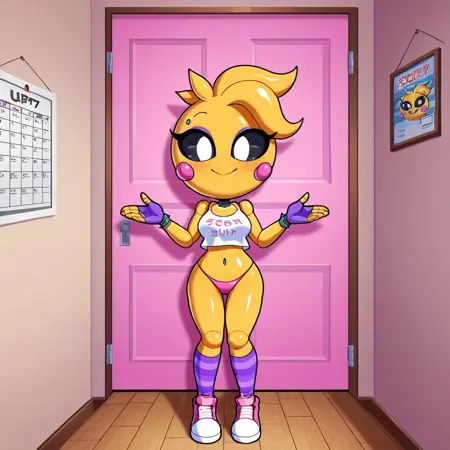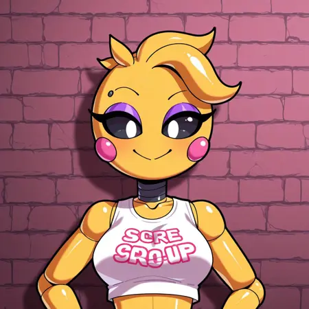Toy Chica, female, animatronic, blonde hair, pink cheeks, black sclera, white pupils,