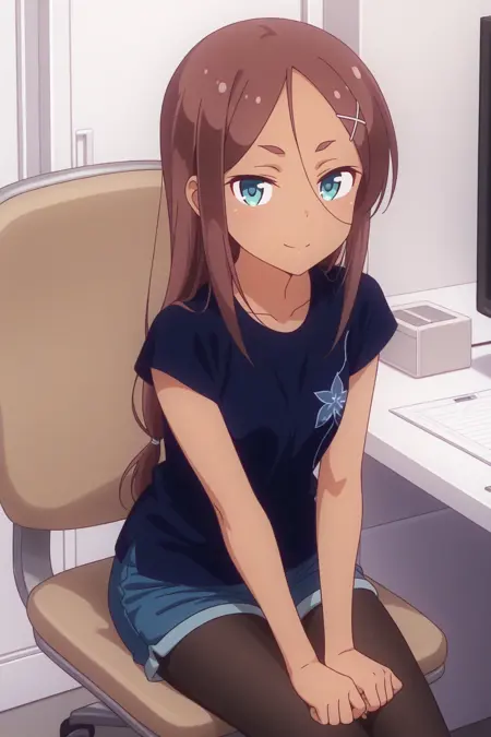 aaumiko, 검은 피부, 파란 눈, 갈색 머리, umikoc1, x 헤어 장신구, 검은 셔츠, 티셔츠, 청바지, 검은 팬티스타킹, 바지 아래 팬티스타킹,