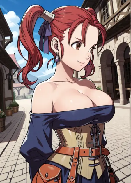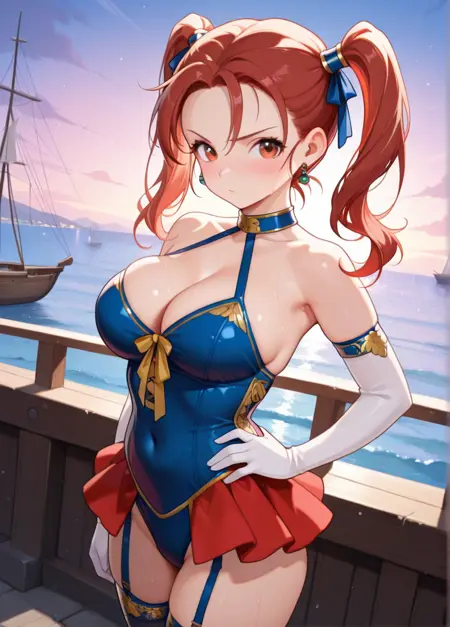 corset, blue shirt, jewelry, strapless, shirt, earrings, bare shoulders, belt, red skirt, boots,