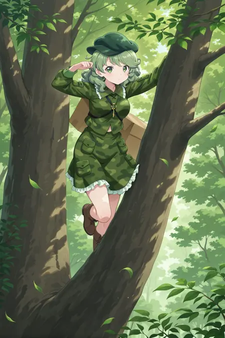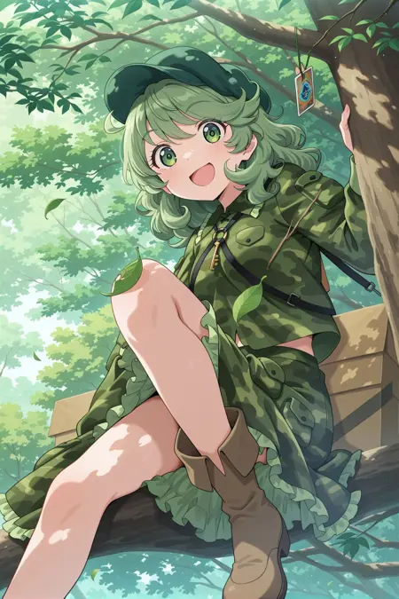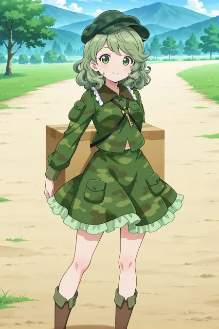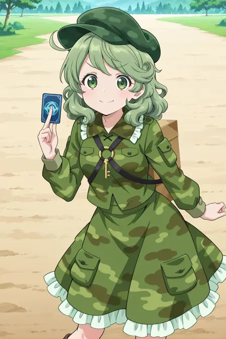 aqua hat, flat cap, key, green shirt, camouflage shirt, long sleeves, pocket, green skirt, camouflage skirt, frilled skirt, brown boots, shoulder strap,