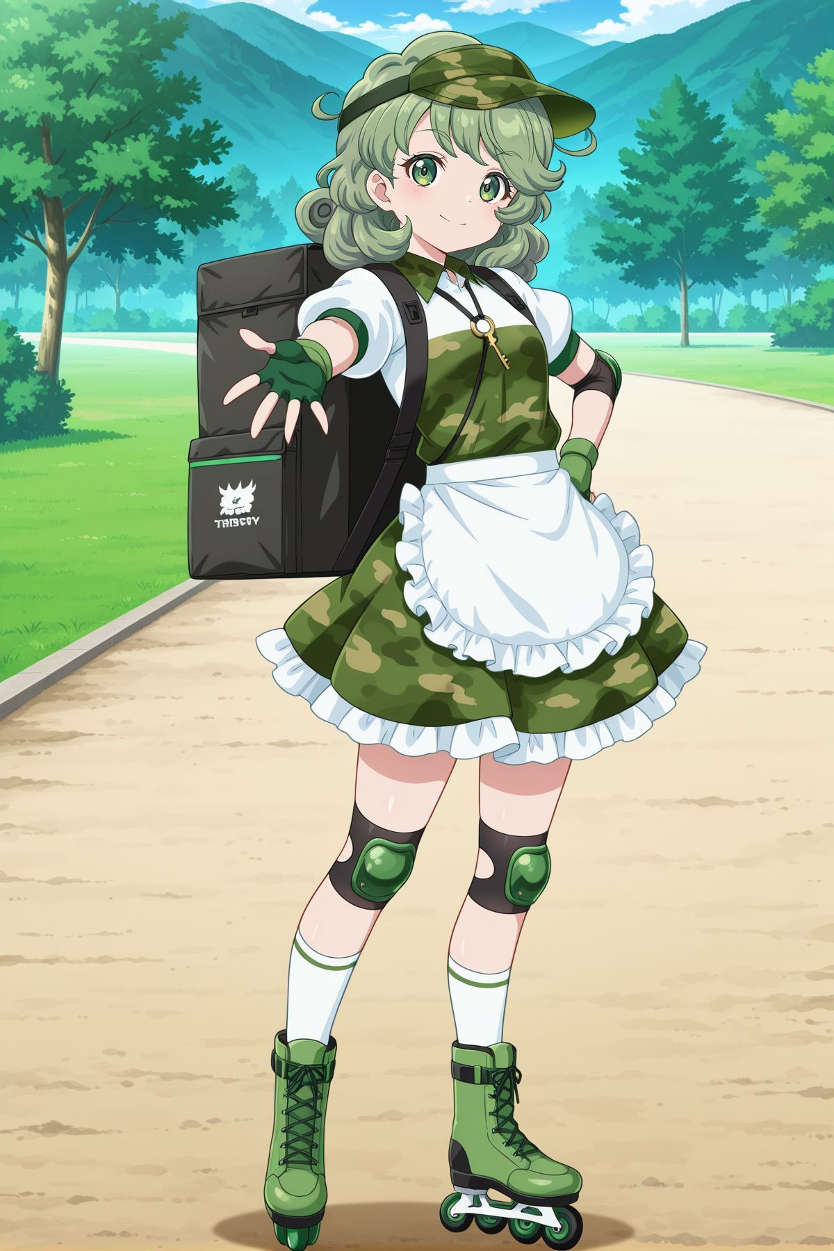 yamashiro takane, 1girl, solo, green eyes, green hair, medium hair, yamashiro takane \(forest fried delivery\), alternate costume, green headwear, flat cap, visor cap, key, white shirt, collared shirt, puffy short sleeves, green top, camouflage dress, white apron, frilled apron, waist apron, elbow pads, green gloves, fingerless gloves, backpack, black bag, insulated delivery bag, knee pads, white socks, green boots, skates,