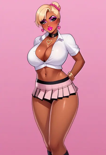 1girl, gyaru, smile, breasts, large breasts, cleavage, dark skin, dark-skinned female, jewelry, hoop earrings, earrings, bracelet, nail polish, long nails, blonde hair, side ponytail, bangs, long hair, blush, collarbone, underwear, makeup, tan, heart, choker, pleated skirt, multicolored hair, bare shoulders, necklace, panties, thighhighs, hair ornament, school uniform, lipstick, animal print, leopard print, nipples, miniskirt, tongue out, grin, thick thighs, shiny skin, fingernails,