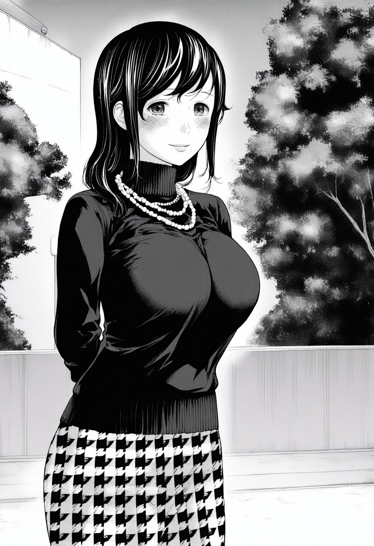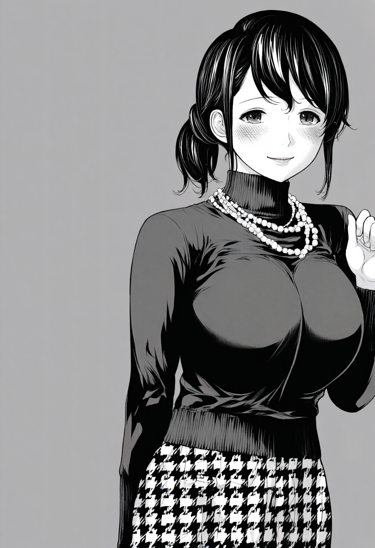 服装: 高领毛衣、深蓝色毛衣、珠链、长袖、人字纹裙子、人字纹、未塞入的毛衣,