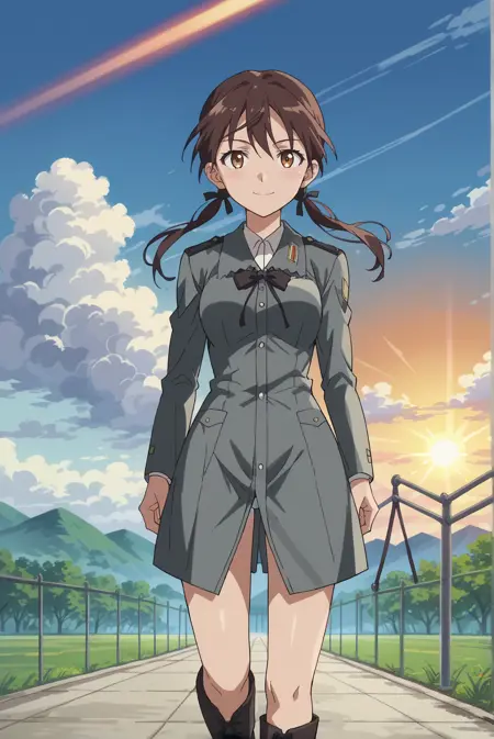 기본 설정: gert-bar, def, 1girl, 갈색 눈, 갈색 머리, 낮은 트윈테일, 군용 재킷, 회색 재킷, 검은 리본, 흰색 셔츠, 부츠