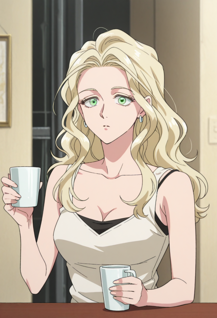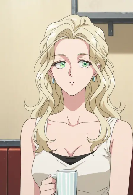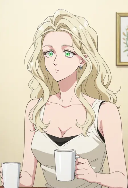 트리거 = zzyoumeizz, 태그 = 금발, 1소녀, 긴 머리, 녹색 눈, 단독, 귀걸이, 보석, 가슴, 가슴 사이, 들고 있음, 쇄골, 셔츠, 컵, 팔 없음, �ANK 탑