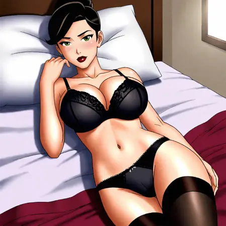 바디수트 포함 트리거: RebeccaBodysuit, 1girl, 검은 머리, 한 줄기 머리단발, 장갑, 벨트, 단발, 립스틱, 메이크업, 바디수트, 가슴