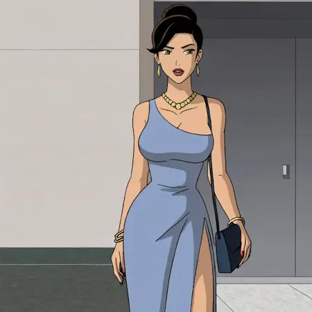 드레스 포함 트리거: RebeccaDress, 1girl, 파란 드레스, 보석, 팔찌, 검은 머리, 한 줄기 머리단발, 핸드백, 목걸이, 사이드 슬릿, 귀걸이, 립스틱, 성숙한 여성, 메이크업, 가슴, 카우보이 샷