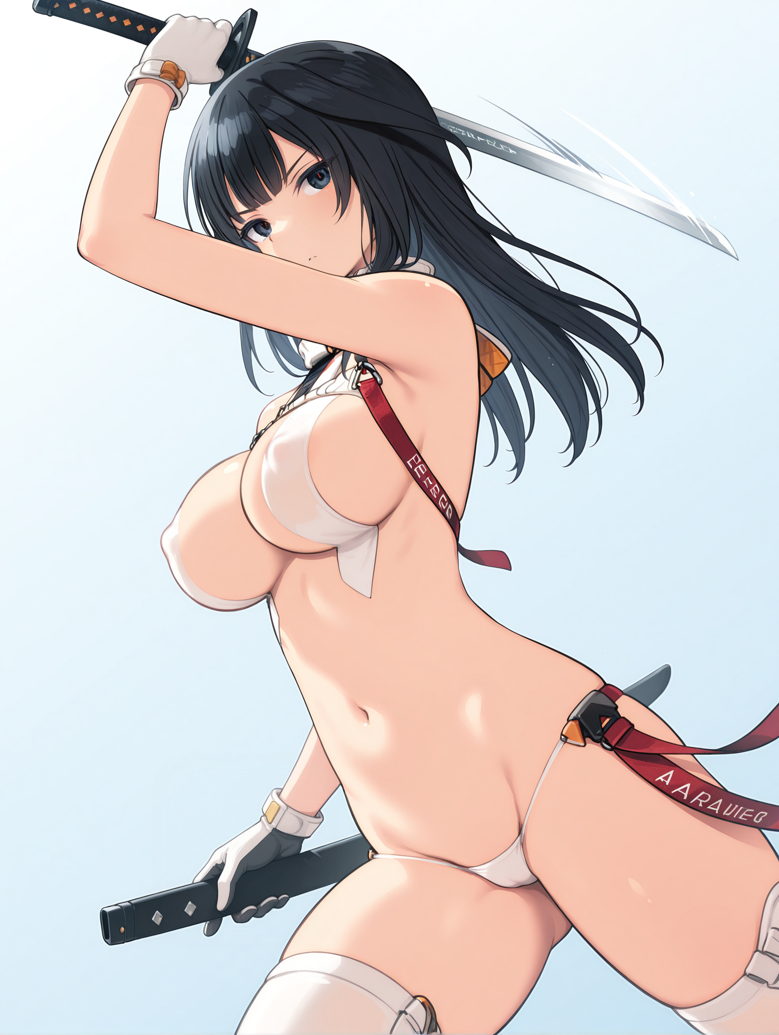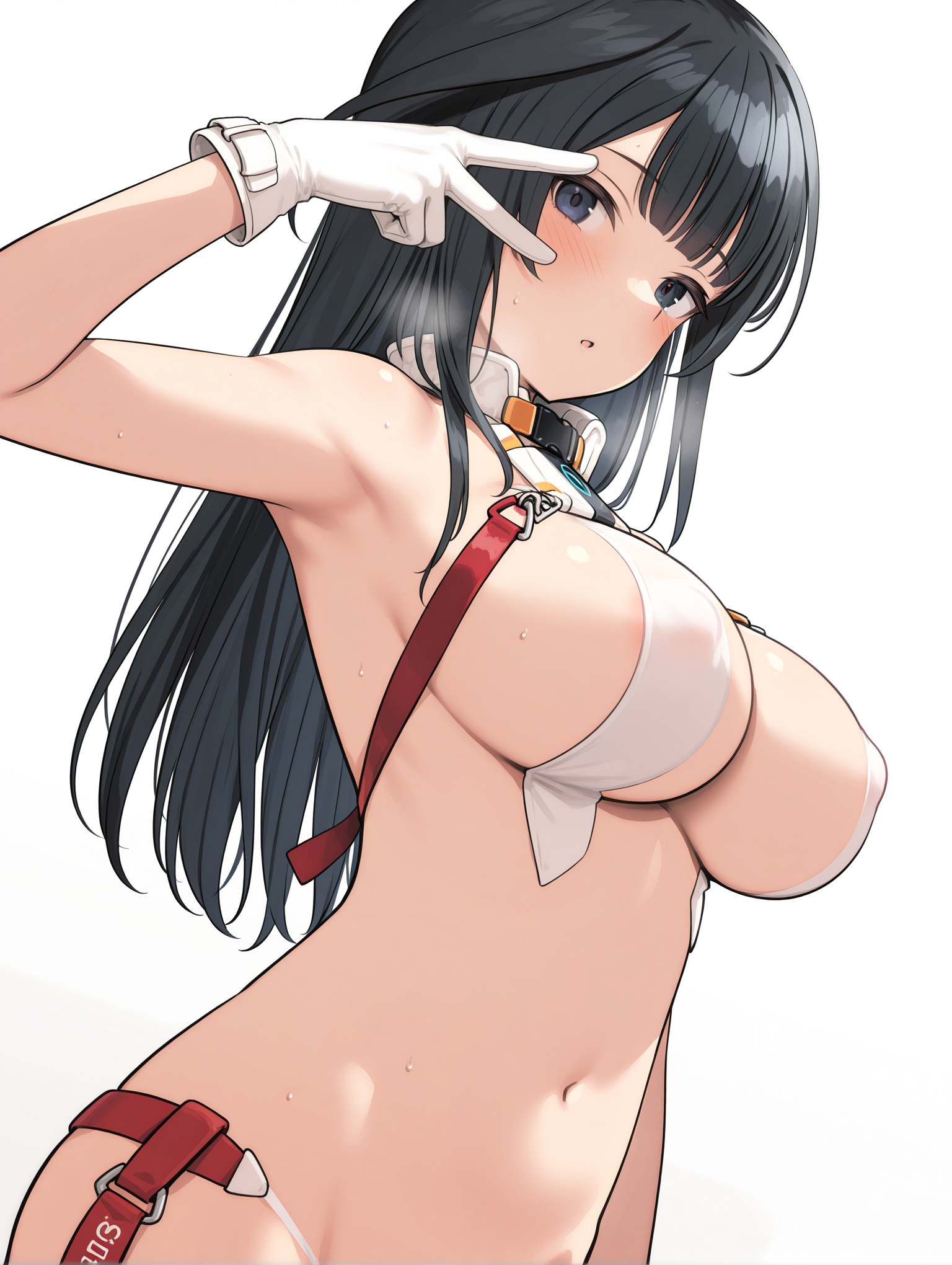 Clothing (The Suit): f_clothes, revealing clothes, bare shoulders, red strap, white gloves, lowleg panties, white_thighhighs, white sneakers,