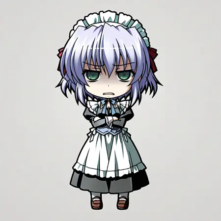 panorama,front view,white_background,simple_background,full_shot,full body,1girl,solo,green eyes,short hair,contempt,maid,
