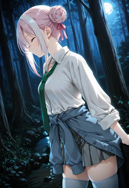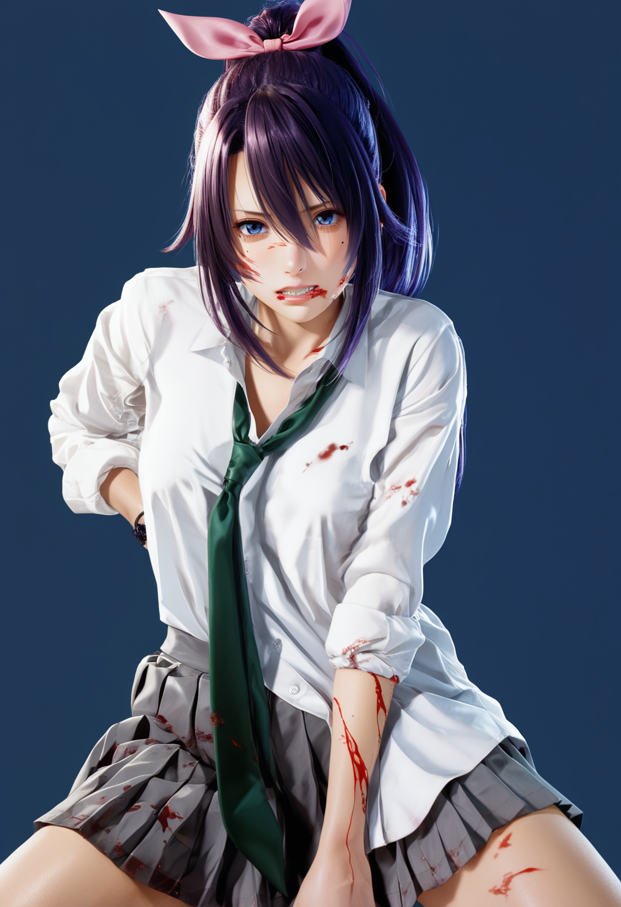outfit: pink hair ribbon, green necktie, loose necktie, white wing-collared shirt, open collar, partially unbuttoned shirt, long sleeves, sleeves rolled up, sleeves past elbows, grey pleated miniskirt, deep blue cardigan, cardigan around waist, white thighhighs, purple cross-laced high-tops sneakers,