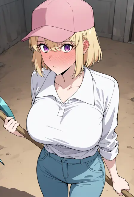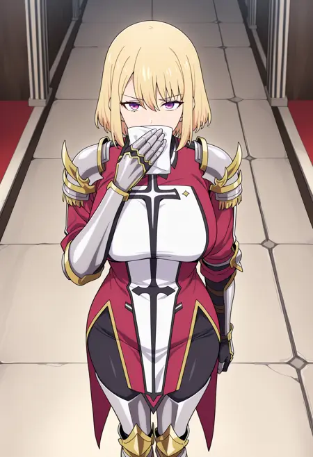 shichaearmor, short hair, blonde hair, hair between eyes, bangs, sidelocks, purple eyes,
