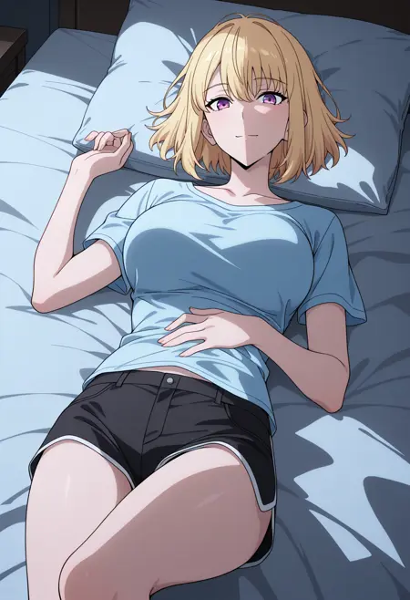 shichaecasual, short hair, blonde hair, hair between eyes, bangs, sidelocks, purple eyes,