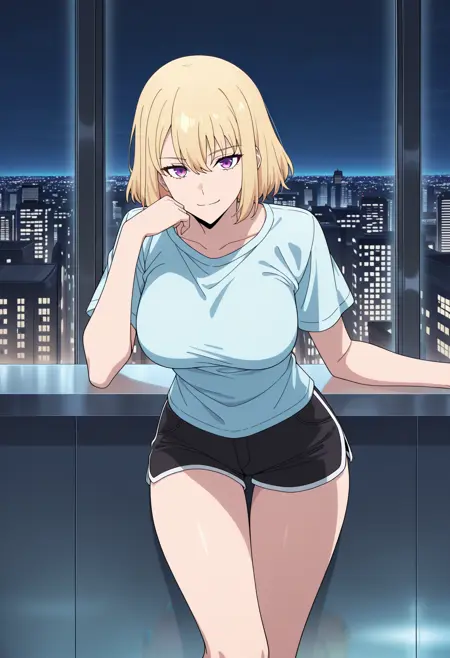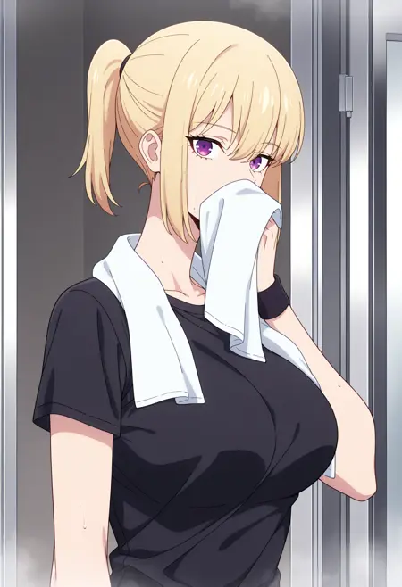 shichaeworkout, short hair, blonde hair, hair between eyes, bangs, sidelocks, purple eyes, ponytail,