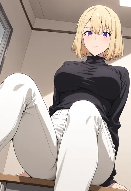 large breasts, blue sweater, black sweater, turtleneck sweater, white pants,
