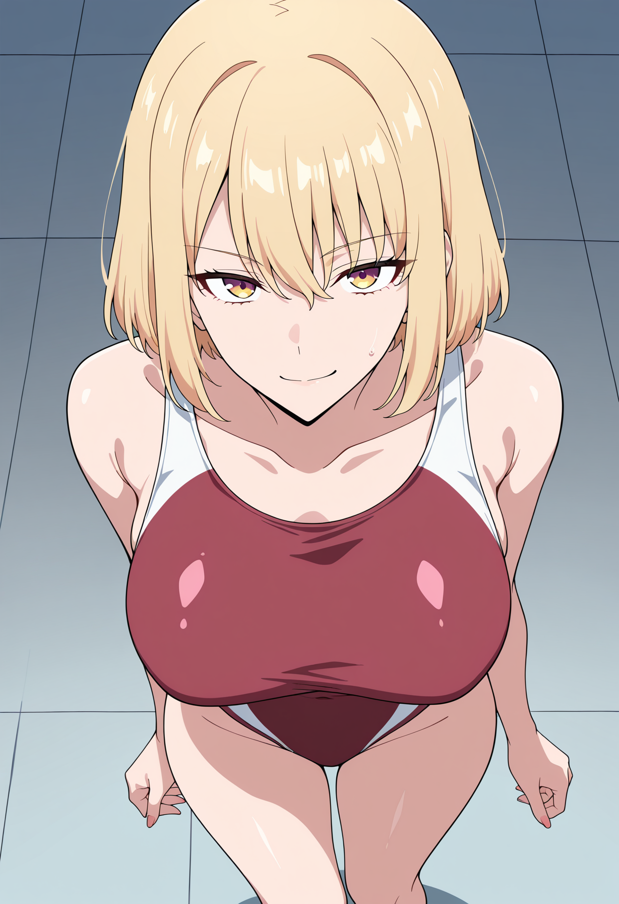 large breasts, collarbone, red one-piece swimsuit, competition swimsuit, bare legs,
