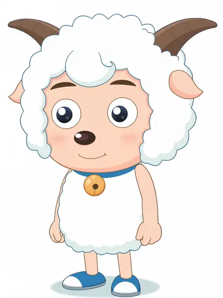 프롬프트: weslie, 1boy, furry male, sheep boy, four fingers, short legs, blue eyes, white hair, sheep horns, animal nose, sheep ears, blue choker, bell, blue footwear,