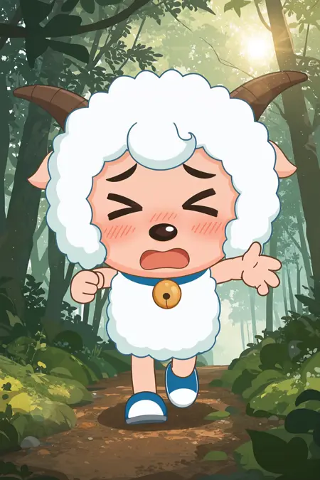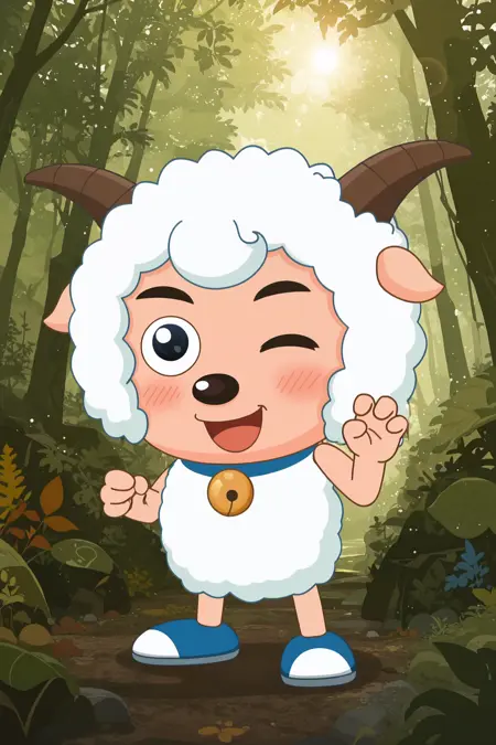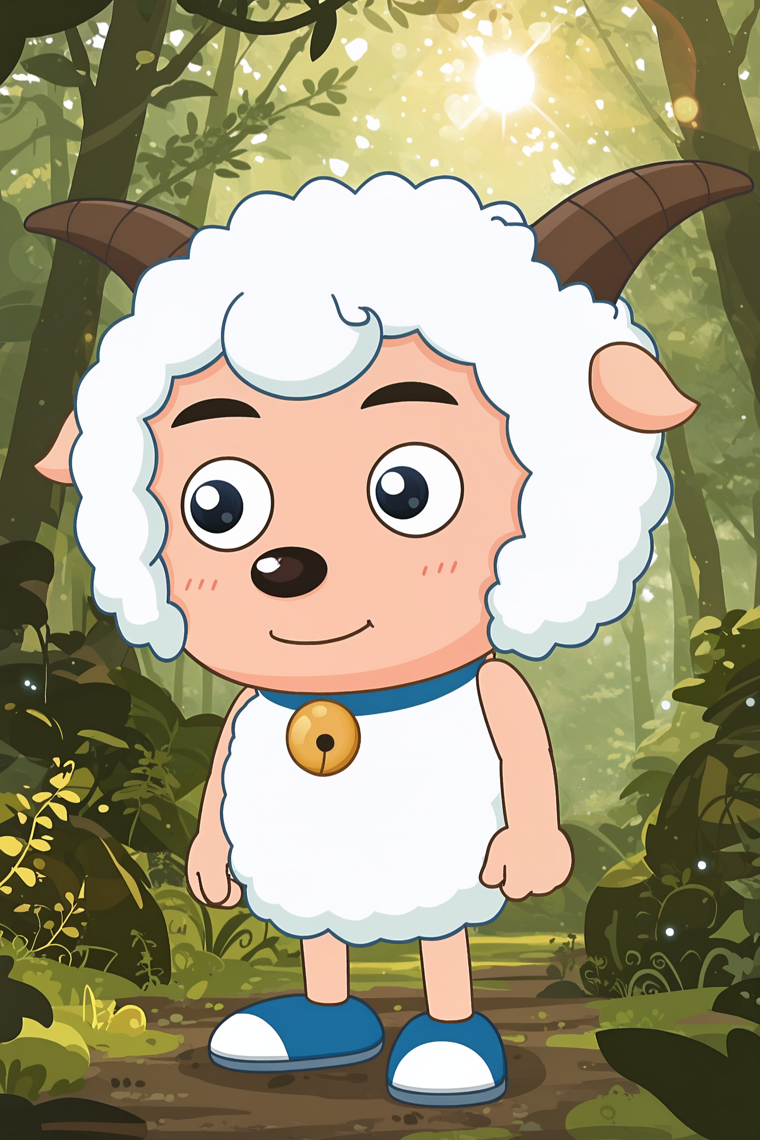 プロンプト:weslie, 1boy, furry male, sheep boy, four fingers, short legs, blue eyes, white hair, sheep horns, animal nose, sheep ears, blue choker, bell, blue footwear,