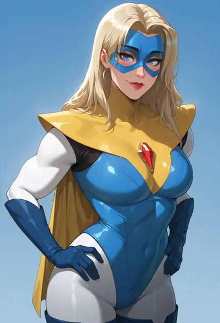 ma1n_bl0nd3_b1az3r, 1girl, solo, blonde hair, long hair, blue eyes, lips, large breasts, superhero, blue mask, domino mask, multicolored bodysuit, white bodysuit, blue bodysuit, yellow bodysuit, red gemstone, yellow cape, blue gloves, elbow gloves, blue boots, tight boots