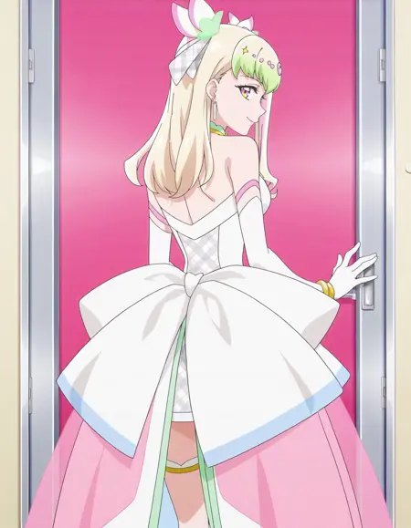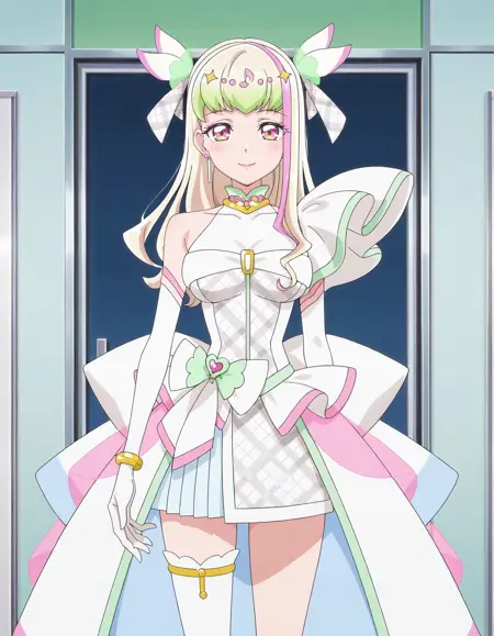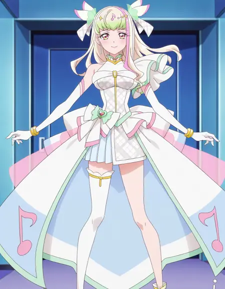 애니메이션 스크린캡, 단독, 1소녀, curezukyoon, 장갑, 팔꿈치 장갑, 보석, 아이돌, 드레스, 허벅지 긴 양말, 귀걸이, 음표, 리본, 흰 장갑, 팔찌, 머리 장식, 어깨 노출, 단일 허벅지 긴 양말, 메이크업, 마법의 소녀, lora:curezukyoon_IL:0.8 고해상도, 놀라운 품질, 최고 품질, 매우 미적, 걸작, absurdres,