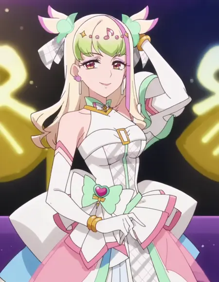 anime screencap, solo,1girl, curezukyoon, gloves,elbow gloves, jewelry, idol, dress, thighhighs, earrings, musical note, bow, white gloves, bracelet, hair ornament, bare shoulders, single thighhigh, makeup, magical girl,lora:curezukyoon\_IL:0.8high definition,amazing quality,best quality,very aesthetic,masterpiece,absurdres,