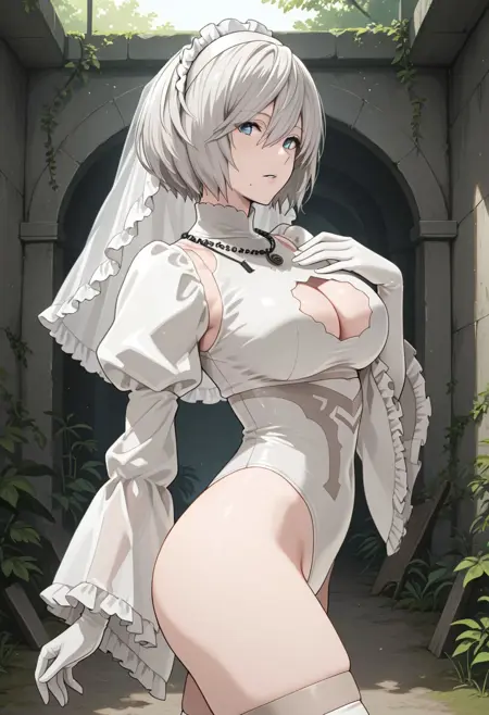 2bWedding, 1个女孩, 单人, 服装剪裁, 婚纱手套, 胸部露肤, 高跟鞋, 大胸部, 曲线美, 宽臀, 银发, 短发, 蓝眼, 过膝袜, 白色连衣裙, 过膝靴, 高跟靴, 白色紧身衣, 发带, 无眼罩, 长袖, 黑色配白色手套, 宽袖, 白色过膝袜, 大腿绑带, 胸部露肤, 粉色嘴唇, 蓬松袖子, 内衣, 嘴下有痣, 裙内穿紧身衣, 嘴唇微张, 朱丽叶袖, 荷叶边, 白色荷叶边发带, 分离袖子, 侧开衩, 面纱, 项链, 高开叉, 透视衣物,