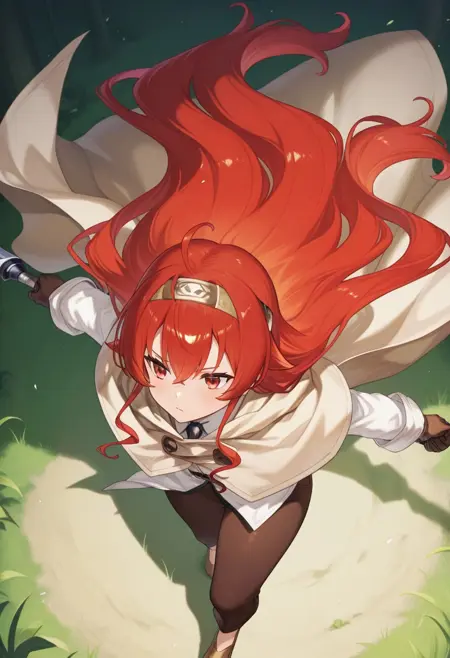 1 girl, erismt, ahoge, 빨간 머리, 매우 긴 머리, 빨간 눈, 머리끈, 망토, 흰색 망토, 흰색 셔츠, 셔츠, 긴 소매, 검은 칼, 갈색 장갑, 갈색 바지, 갈색 신발
