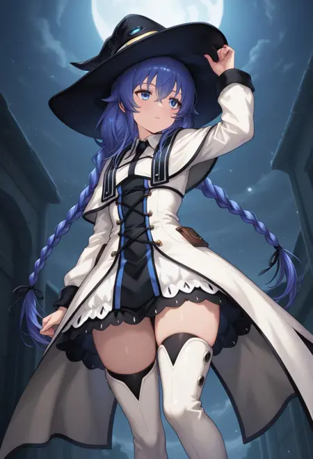 1 girl, Roxymt, 파란 머리, 땋은 머리, 쌍 땋은 머리, 긴 머리, 머리 리본, 검은 리본, 파란 눈, 마녀 모자, roxymt 모자, 갈색 로브, roxymt 로브, 드레스, 흰색 드레스, 허벅지 부츠, 흰색 부츠