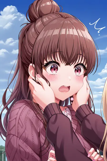 airi, 1girl, solo, brown hair, thighhighs, looking at viewer, long hair, smile, brown eyes, hair ornament, white thighhighs, flower, hair flower, skirt, zettai ryouiki, side hair bun, thigh boots, belt, sleeveless, stgotf