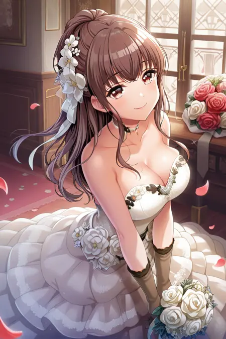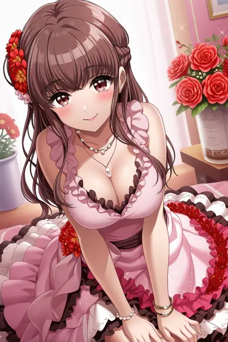 airi, 1girl, solo, breasts, long hair, brown hair, flower, cleavage, hair ornament, hair flower, jewelry, frills, looking at viewer, braid, skirt, smile, bracelet, brown eyes, large breasts, red flower, altsk