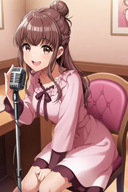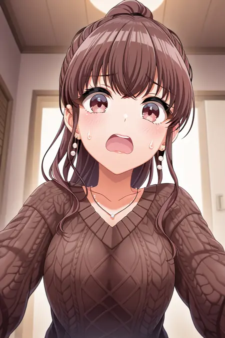 airi, 1girl, solo, brown hair, shirt, looking at viewer, white shirt, brown eyes, pants, apron, black footwear, smile, brown apron, ponytail, long hair, black pants, sidelocks, long sleeves, collared shirt, bangs, wrksk