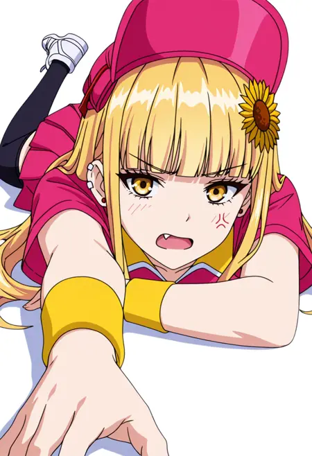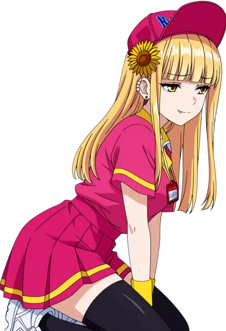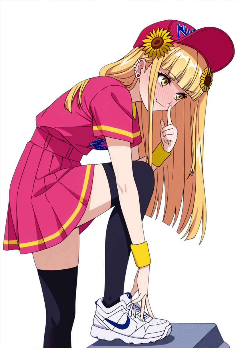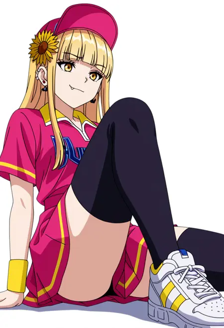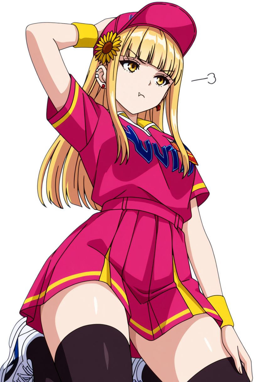 ruriko_s1, uniform_cnr,hat,pink shirt, black thighhighs,pink skirt,white sneakers, wristband, sunflower hair ornament,