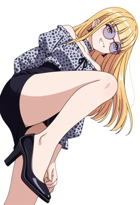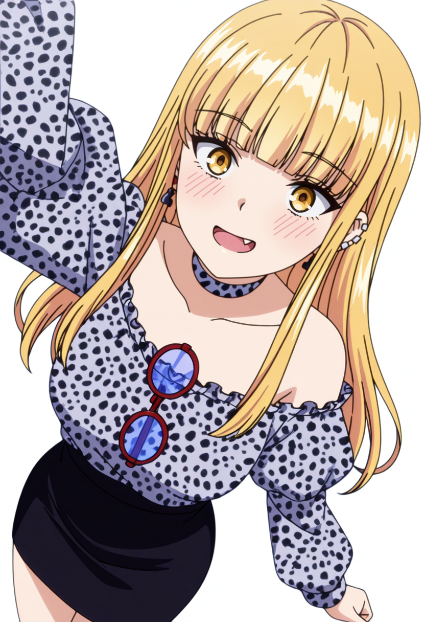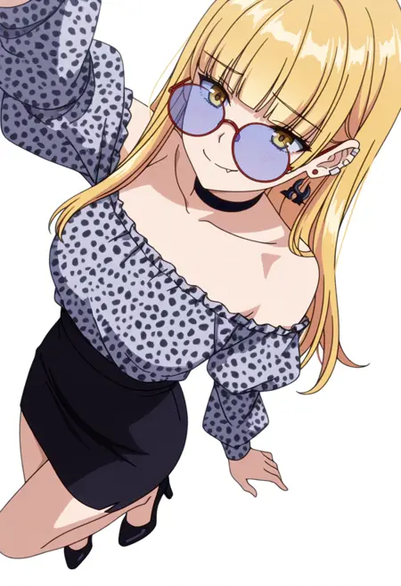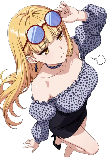 ruriko_s2, collarbone,grey shirt, off shoulder, long sleeves, puffy sleeves,black pencil skirt, leopard print,choker,eyewear, sunglasses,black high heels,