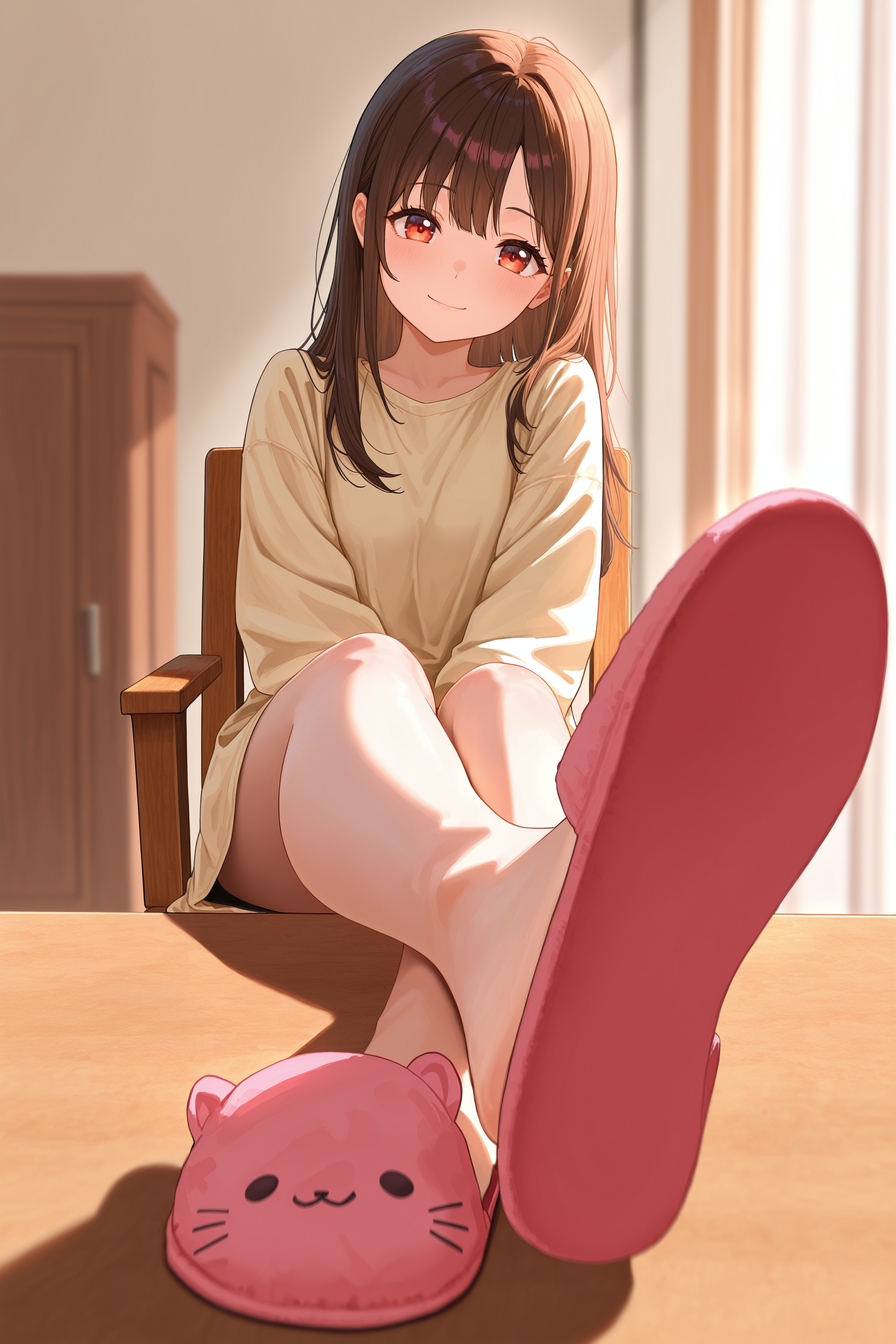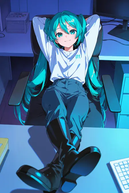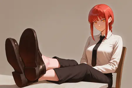 책상에 발을 올리는 경우(가로 레이아웃에서 더 잘 작동): sitting, outstretched legs, feet on table, crossed ankles, full body, on chair