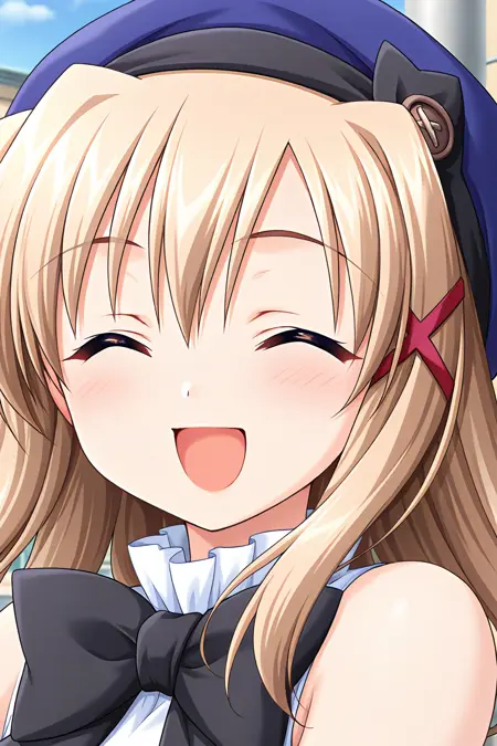school uniform,beret,blue headwear,hat ribbon,black ribbon,sleeveless shirt,frilled shirt collar,bare arms,black bowtie,white sleeveless,white bow,back bow,black skirt,wrap skirt,blue skirt,high-waist skirt,cross-laced skirt,lace-trimmed skirt,black lace,petticoat,zettai ryouiki,white thighhighs,blue ribbon,thigh ribbon,shoes,sneakers,blue footwear,